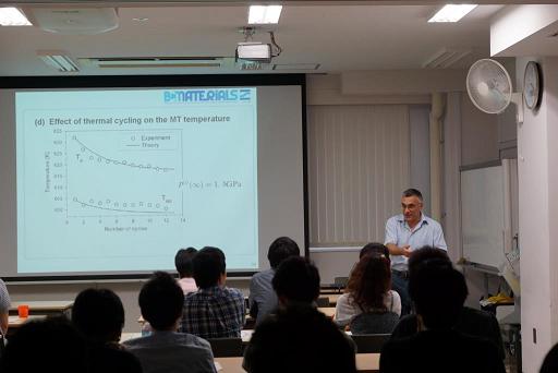 磁性形状記憶合金は巨大な磁気歪みを有し,高速駆動が可能な次世代アクチュエータ材料として期待されており,世界中で活発に研究が行われています.Chernenko教授はNiMnGa合金をはじめとした磁性形状記憶材料の研究に関して世界的な第一人者であり,基礎研究から応用開発まで幅広く取り組まれております.今回はJSPS短期招聘事業により2ヶ月間,客員研究員として精研に滞在されております.講演会では磁性形状記憶合金の基礎から最新の研究成果までを大変わかりやすく説明していただきました.参加者は30名であり,講演後の質疑応答では予定時間をオーバーして熱心な討論が行われました.講演者のChernenko教授,出席者の皆様に感謝いたします.(文責:先端材料部門・教授 細田秀樹)